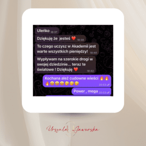 … Ula jest niezwykle mądrą osobą… Oczytaną, wrażliwą , subtelną i jednocześnie silną.. Osobą która zna swoje jakości i potrafi za nimi podążać… Mało tego, ma swego rodzaju wsparcie… jakby niezwykłe połączenie i prowadzenie… Sama byłam świadkiem, gdy wspólnie rozwiązywałyśmy jakiś problem, nagle otwierała książkę na cytacie który wskazywał rozwiązanie …. Takie zdolności to kochani posiadają tylko nieliczni … I Ula do nich należy … Troskliwa i uważna na innych… Podpowie… Zada pytanie.. A jak nie, to kopnie w tyłek.. potrząśnie… że sam człowieku wskoczysz na odpowiednie tory , albo rozplączesz zapieczony zwój w swojej mózgownicy …. Mogłabym jeszcze parę rzeczy napisać … Ale powie że lizus jestem, to na tym poprzestanę😅 Jeśli nie boicie się stanąć w prawdzie o sobie… Jeśli potrzebujecie wsparcia, mentora, coacha, to pukajcie do jej drzwi … 🤗❤️ (wyrażam zgodę na udostępnianie tekstu )💖💖💖.