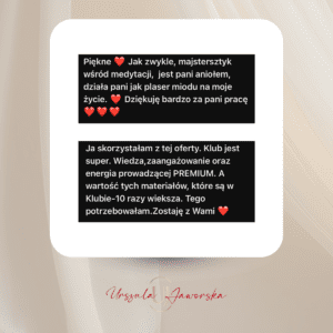 Ula jest jak przypominajka ,zawsze kiedy brakowało mi elementu układanki pojawiała się czy to ze swoją wiedzą,czy swoim kursem,czy sesja a medytacje to zaczarowana bajka której Ty jesteś kreatorem swojej rzeczywistości..i dzięki nim uczysz się że można oczekiwać nie nieoczekiwanego i że nie ma niemożliwego..i że obfitość jest wszędzie..tylko trzeba chcieć tak od serducha..wdech sercem..wydech sercem ❤️❤️❤️❤️❤️
